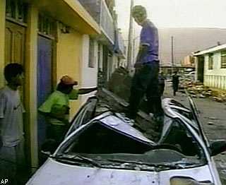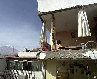 Als ich schliesslich nach hause kam waren alle dsehr erleichtert. Sie sassen im Park vor dem Haus, weil keiner sich reingetraut hat, da es ein 4 stoeckiges haus ist. Wir haben dann auch nicht da geschlagfen, sondern in dem has von einer freundin, das ebenerdig ist, mit offener tuer, angezogen und mit schuhen, dass wir gleich raustrennen koennen, falls nochmal was passiert. Es hat dann auch noch 2 mal staerker und mehrere mal etwas weniger gebebt, aber wenigstens hatten wir wieder licht. Das hat die ganze situaton etwas entschaerft, weil wenn du bei kerzenschein in enem zimmr hockst und immer darauf wartest dasses wieder anfaengt, das is kein spass, sag ich euch. Konnte erst gar nicht mehr lachen so zerrettelt war ich innerlich. Heute haben sich alle wieder einigermassen beruhigt. Die aufraeumungdsarbeiten haben begonnen und die campesinos-die armn bauern-deren haeuser alle eingestuertzt sind werden in schulen untergebracht. Ich weiss noch nicht, ob ich heute daheim schlafen will,mit meinen freunden find ichs angenehmer. Leider gab es 53 Tote, hauptsaechlich in den armen doerfern in den Randgebieten. Situation nach Erdbeben schlimmer als befürchtet - Die Welt (28.6.01)Die Naturkatastrophe in Peru fordert mindestens 97 Tote. Die EU schickt 1,15 Millionen Euro für die obdachlos gewordenen MenschenVon Alicia Rauschert Berlin - Drei Tage nach einem der schwersten Erdbeben in der peruanischen Geschichte wurde das Andenland erneut von einem Beben erschüttert: Am Dienstagmorgen erreichte ein Nachbeben 5,7 Punkte auf der Richterskala. Viele Menschen standen noch unter Schock von dem schweren Erdbeben vom Samstag. Bislang starben dabei 97 Menschen, 1200 wurden verletzt und mindestens 66 gelten als vermisst. Zunächst nahm der Geological Survey der USA (USGS) eine Stärke des Bebens von 7,9 auf der Richterskala an, korrigierte dies aber später mit 8,1. Damit war es das stärkste Erdbeben in Peru seit 1970. Damals kamen über 70 000 Menschen ums Leben. Allein in der Region Tacna und Arequipa sind rund 80 Prozent aller Gebäude beschädigt oder zerstört. Erst im vergangenen Dezember war der historische Stadtkern von Arequipa von der Unesco zum Weltkulturerbe erklärt worden. Einige der aus weißem Tuffstein errichteten Gebäude wurden unwiederbringlich zerstört. Auch einer der Türme der majestätischen Kathedrale stürzte ein. Zahlreiche Straßen wurden verschüttet, Telefon- und Stromleitungen unterbrochen. Die Stadt Tacna ist seither - wie viele andere Kommunen - von der Außenwelt abgeschnitten. Lediglich lokale Radiostationen in der Umgebung arbeiten noch und senden Lebenszeichen von Hörern an ihre Familien. Die Einheimischen beklagen sich über fehlende oder zu langsam anlaufende Hilfsleistungen. "Wir schlafen auf der Straße, und niemand hilft uns. Rettungskräfte kommen und gehen einfach wieder", sagt die 41-jährige Giovana Arriol, die mit Mann und Kindern bereits zwei bitterkalte Nächte im Freien verbrachte. Doch die dringend benötigte Hilfe ist schon unterwegs: Flugzeuge der peruanischen Luftwaffe brachten Medikamente und Lebensmittel, Zelte und Decken. Für das hoch verschuldete Peru ist es unmöglich, den Wiederaufbau ohne internationale Hilfe zu bewältigen. Übergangspräsident Valentin Paniagua bat, solidarisch zu sein "mit den Peruanern, die sich in dieser verheerenden Lage befinden". Er beantragte bei der Interamerikanischen Entwicklungsbank einen Sofortkredit in Höhe von 20 Millionen Dollar. Die Europäische Union (EU) hilft den Obdachlosen im Erdbebengebiet mit zunächst 1,15 Millionen Euro. Nach Angaben der EU-Kommission in Brüssel ist diese Nothilfe für Grundnahrungsmittel, Medikamente, Notunterkünfte und den sanitären Bereich bestimmt. Je nach Entwicklung der Lage seien jedoch weitere EU-Hilfen möglich.