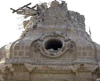 pedazos de concreto se han desprendido de la otra. Una campana rota descansa en